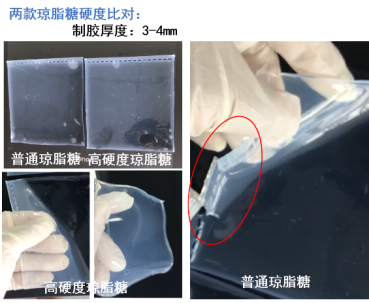 与传统的普通琼脂糖相比,这款产品最大的特点就是硬度提高了30%,可以制作更薄的琼脂糖凝胶,相较于普通5-6mm的琼脂糖凝胶,在不影响使用体验的前提下,可以做到4mm厚度,节约成本25%以上。