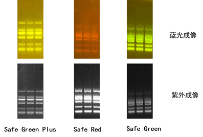 真正做到了安全无毒,使用体验佳,蓝光下成像效果极佳,也可在紫外下成像;而且解决了大部分安全核酸染料没有解决的前染问题,染色条件不限,条带非常整齐、美观,不易出现因条带扭曲而产品的“笑脸”现象。