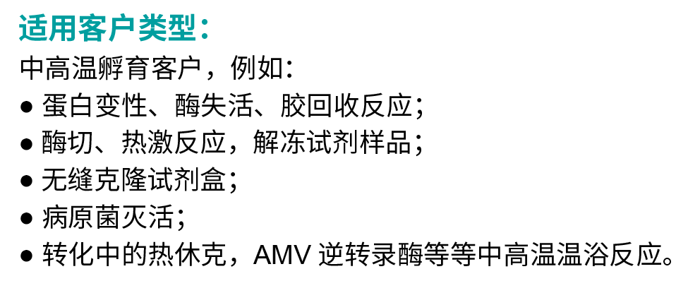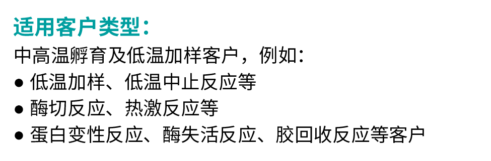 中温区与高温区的温度范围也大大扩展,高温区由之前的55℃-99.9℃延展至30℃-99.9℃,中温区由之前的16℃-55℃延展至8℃-99.9℃,中、高温区部分温区重叠,可以进行同一个温度不同体积的实验,使得应用更灵活,通量更大。低温区4℃-16℃,可以自由搭配多种金属管架、细胞导热托架,进行低温加样、低温温浴反应等。专业温度校准技术,有效保证温度控制准确性;优质帕尔贴与模块保温设计,孔间温度更均一;复合式液体冷却循环系统,变温 更快速。